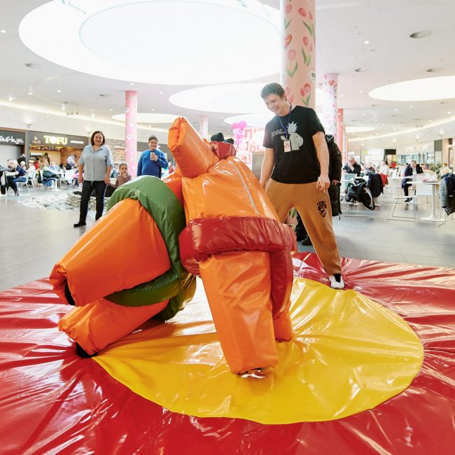 При подготовке этого события мы получили от заказчика (М5 Молл Рязань) общую концепцию: 23 февраля необходимо превратить торгово-развлекательный центр в площадку настоящих мужских развлечений. Мы придумали детали и механику события: пять интерактивных площадок, за успешное прохождение которых участники могут получить игровые жетоны. Их можно обменять на призы возле главной сцены…