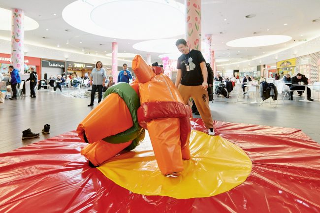 При подготовке этого события мы получили от заказчика (М5 Молл Рязань) общую концепцию: 23 февраля необходимо превратить торгово-развлекательный центр в площадку настоящих мужских развлечений. Мы придумали детали и механику события: пять интерактивных площадок, за успешное прохождение которых участники могут получить игровые жетоны. Их можно обменять на призы возле главной сцены…